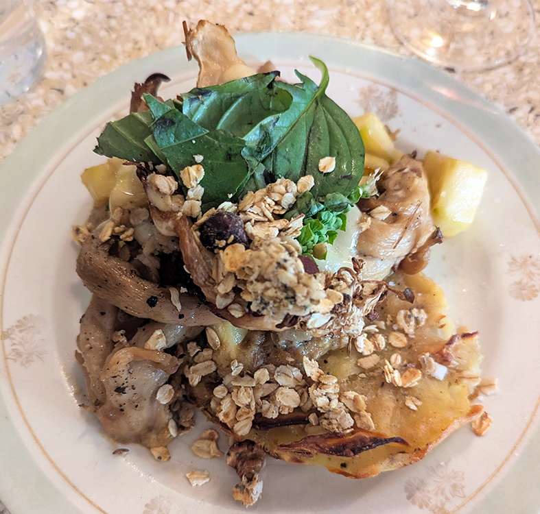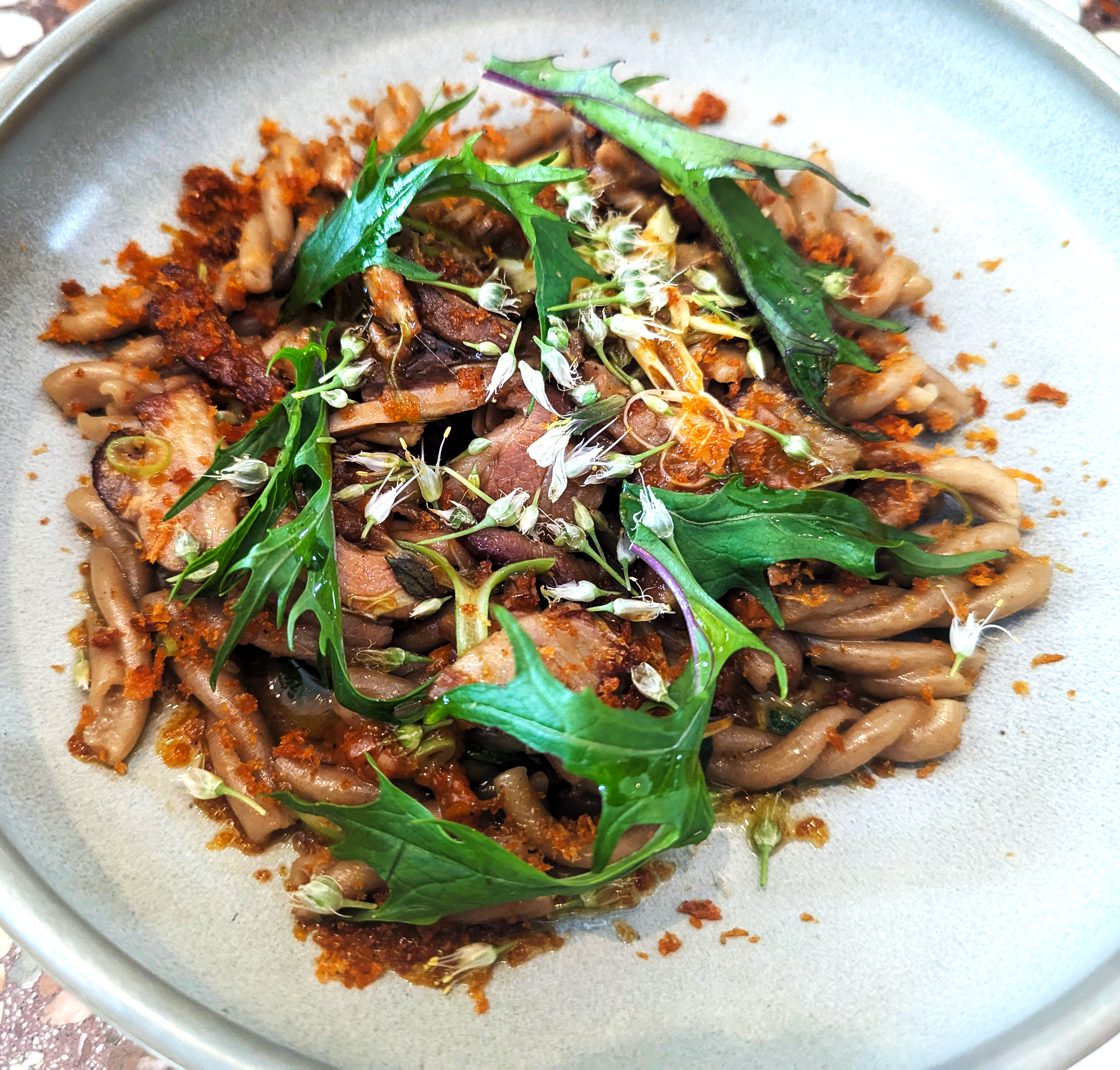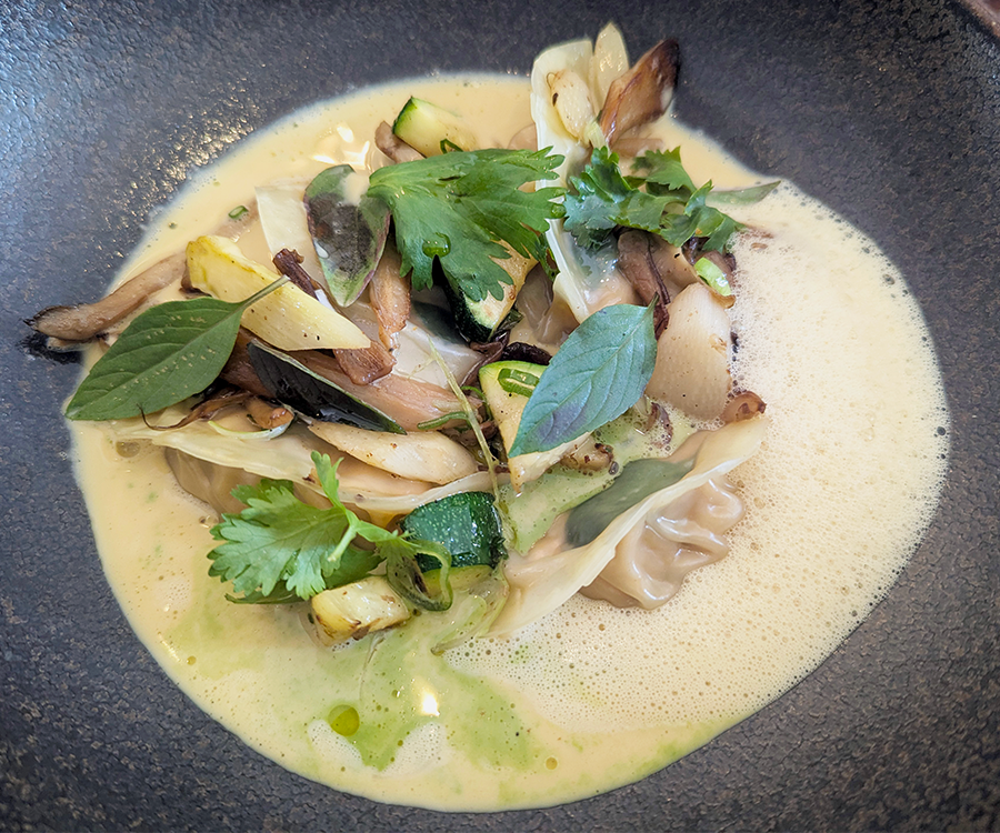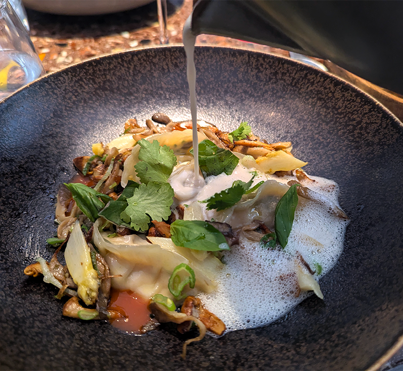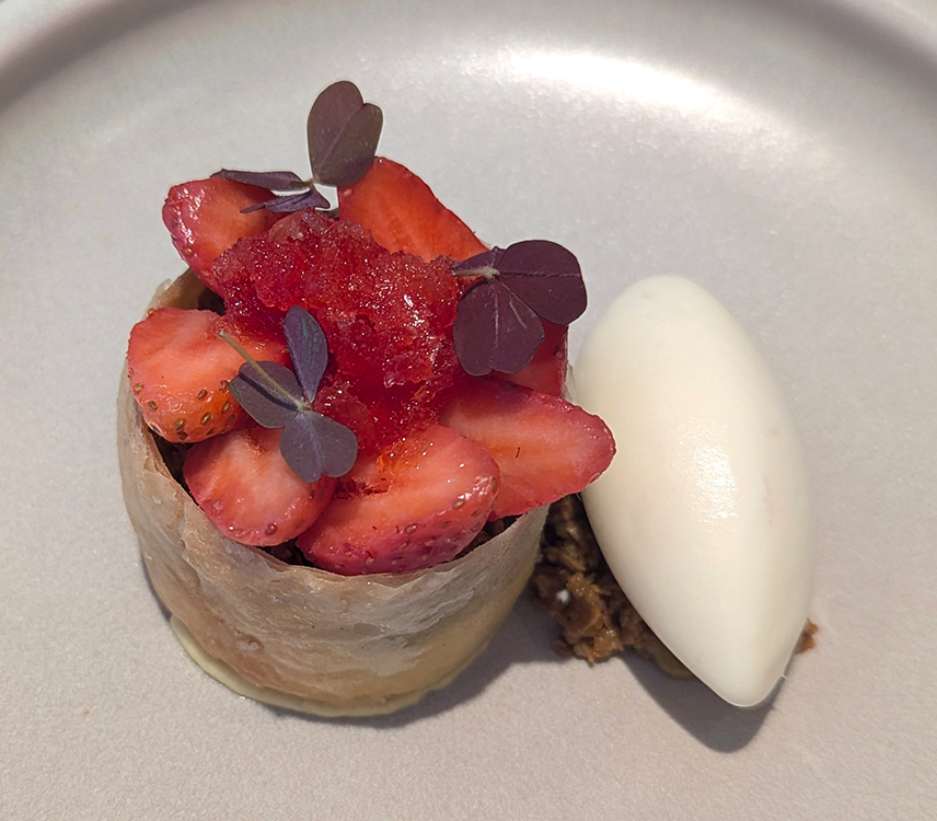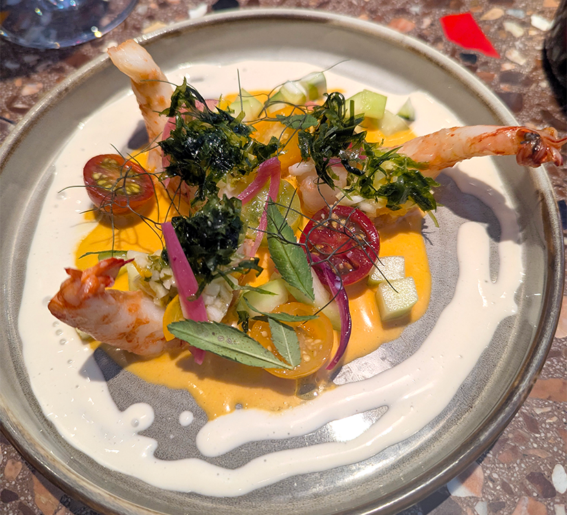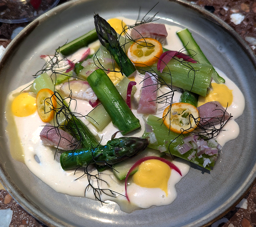 Traditional casarecce pasta was offered with lamb shoulder confit and non-traditional kimchi and gochujang condiments; coiled buckwheat pasta broke out of Italian confines as well. Red tuna gleamed amidst a myriad of fruits, olives and herbs. Shrimp and chicken dumplings were accented with oyster mushrooms, slivered white asparagus and wild garlic – all awaiting a shower of a foamy Thai shellfish broth. Desserts we sampled included a deconstructed strawberry tarte and one with cherries multiple ways.