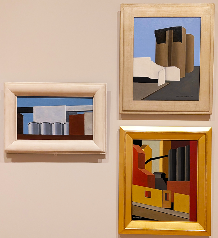 Above top left: “Where the Grass Grows Green,” Dale Nichols (1904-1995), 1939. Bottom left: “Blast Furnace: Changing Shifts,” Louis Lozowick (1892-1973), 1930. Middle: “Flour Mill,” Ralston Crawford (1906-1978), 1937. Top right: “Coal Elevators,” Crawford, 1934. Bottom right: “Industrial Scene,” Miklos Suba (1880-1944), 1930.