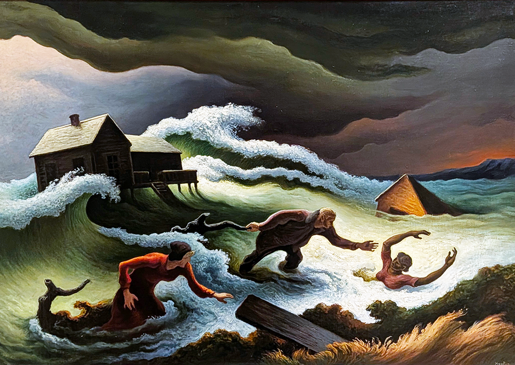 Above: “Flight of the Thielens,” Thomas Hart Benton (1889-1975). “In September 1938, a disastrous hurricane barreled through a Martha’s Vineyard town…. Benton’s painting of the destructive storm depicts his neighbors – the painter Virginia Berresford, her husband, writer Benedict Thielen, and their cook, Josephine ‘Lucy’ Clarke – as they fled their home…. Unable to swim, Clarke was pulled out to sea by 25-foot waves…. Benton depicts her tragic final moments as she reaches up for help… just beyond Thielen’s grasp.” Blanton curatorial notes, “American Modernism from the Charles Butt Collection.”