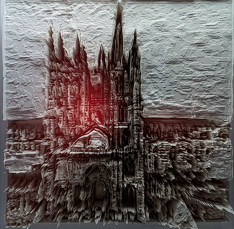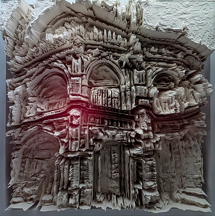 For this work, Amadol trained the system on thousands of images of Gothic and Renaissance cathedrals…. The resulting forms appear as shifting, smoky architectural visions that continuously emerge and dissolve…. this process has become known as a ‘hallucination,’ borrowing a human metaphor to describe how the system imagines beyond what is seen.”