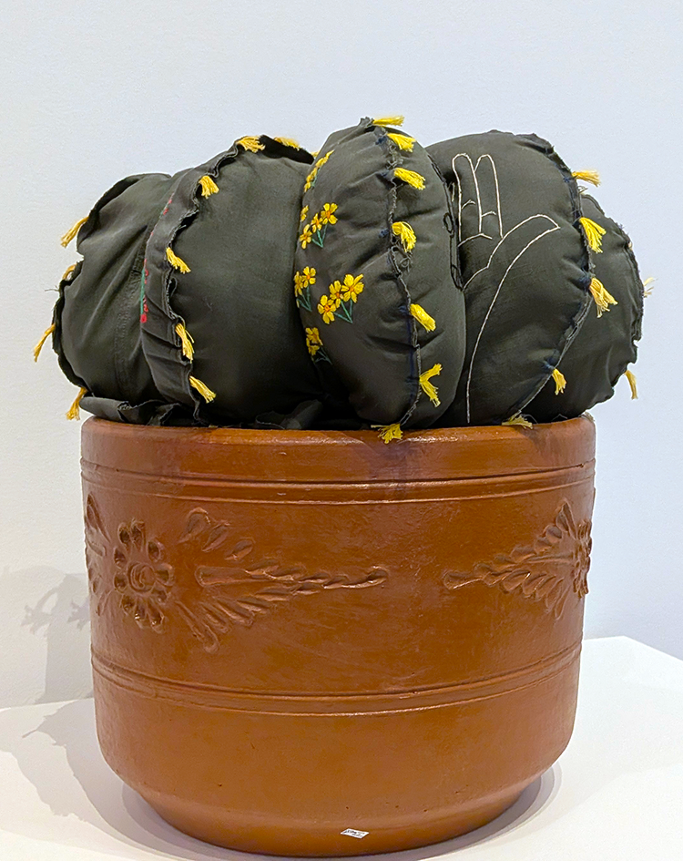 ‘Bisnaga’ or barrel cactus, is one part of an ongoing series of works transforming U.S. Border Patrol uniforms into indigenous desert plants. Collaborating with refugee communities, the artist facilitates workshops for migrants to embroider their stories into the fabric of the artwork.”