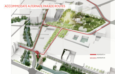 An “almost-not-seen” four-foot fence would be “hidden” in planting beds on the south side and would take the form of 42-inch high glass rails (no longer termed walls) on the museum side on the west. These would be penetrated by four gateways (certainly appearing taller than four-feet high in the rendering below).