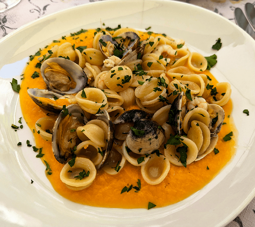 Above: Clams and mussels with oricchiette in pumpkin sauce at Trattoria da Antonio
