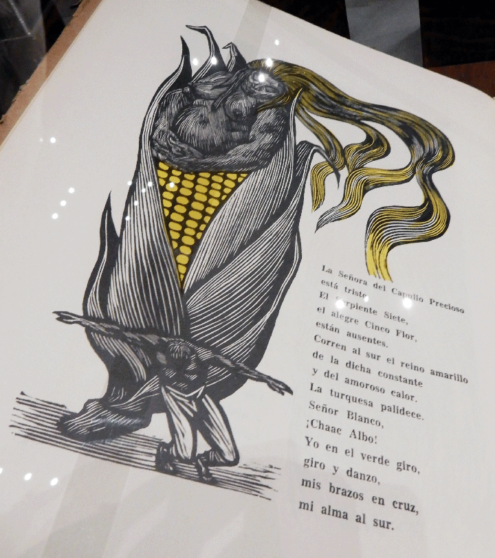 An engraving by Fernando Castro Pacheco illustrates the importance of corn to Mayans in a book by Alfredo Barrera Vasquez, Poema en Cinco Puntos Cardinales, published in Merida in 1976.