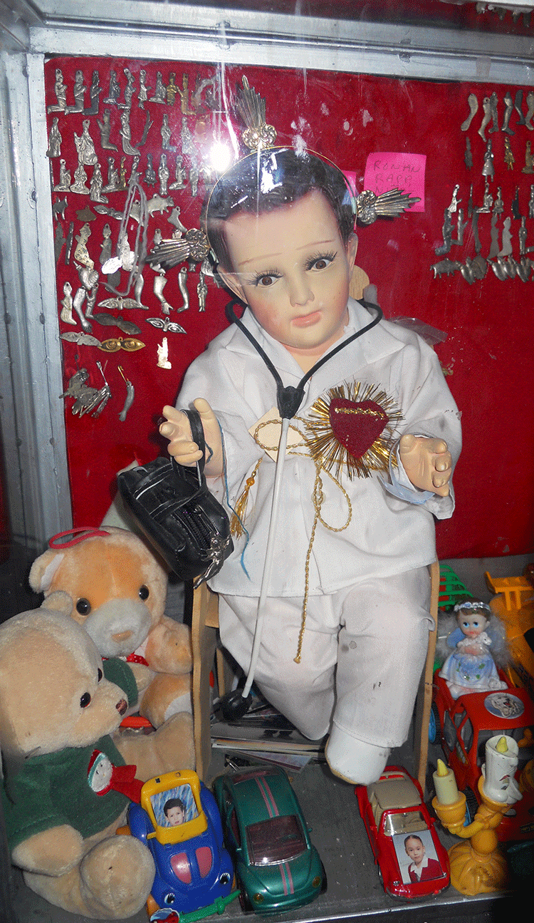 Statues of St. Jude Thaddeus attract desperate pleas for hopeless or lost causes, of which there seem to be no shortage of loved ones fitting in this category. But the ones hitting the hardest are photos of children and toys left with prayers to El Nino. The Mister first pointed this out to me decades ago in Guanajuato, as I watched a Chiclet-selling boy longingly eying the toys locked inside a glass case with a statue of El Nino.