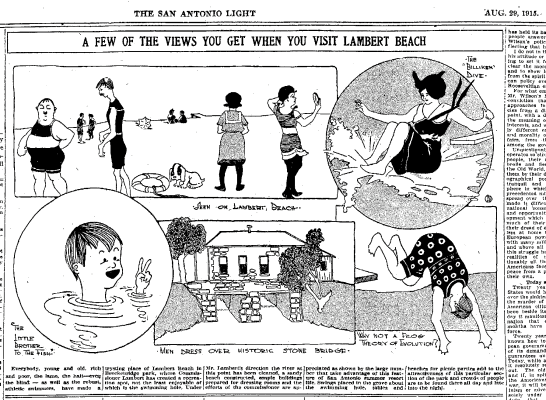 Everybody, young and old, rich and poor, the lame, the halt – even the blind – as well as the robust, athletic swimmers, have made a trysting place of Lambert Beach in Brackenridge Park. San Antonio Light, August 29, 1915