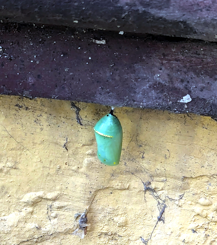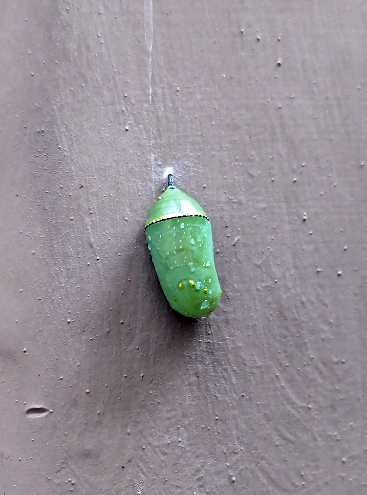 Note added August 2, 2024: Jewels of Queretaro, Mexico. Like shimmering jade pendants ringed with golden beads, they hang within hidden garden walls near the milkweed they’ve almost stripped bare. Gleaming gems get shearer by the day, revealing previews of the wings that will soon carry them away. Will they remain fluttering amongst the blossoms here, a shortcut to their wintering spot in Michoacan, or will Mother Nature insist they fly roundtrip to El Norte first?