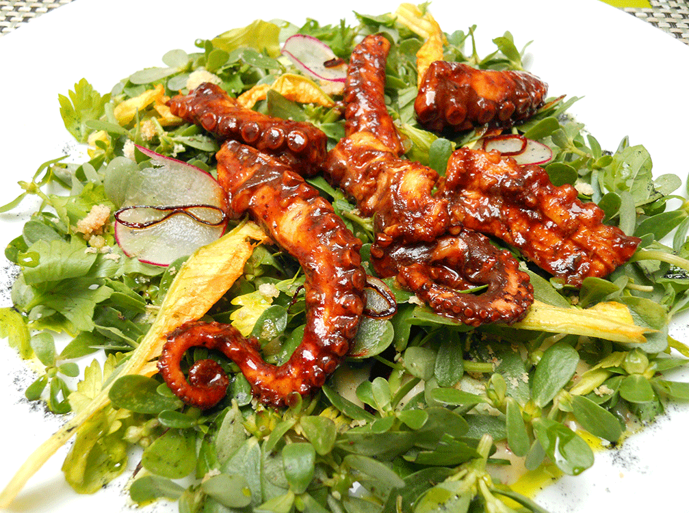 Things the kitchen turned out in the tiny inner courtyards of Origen amazed me. Cold dollops of beet granita contrasted well with roasted beets and pillowy mounds of foamed goat cheese in one salad. An interesting mixture of celery leaves, squash blossoms and purslane actually grabbed more attention then the tender pulpo topping it. A grilled romaine salad was overpowered a bit by the rich sauce, but every bit disappeared. More lima beans in it next time, please.