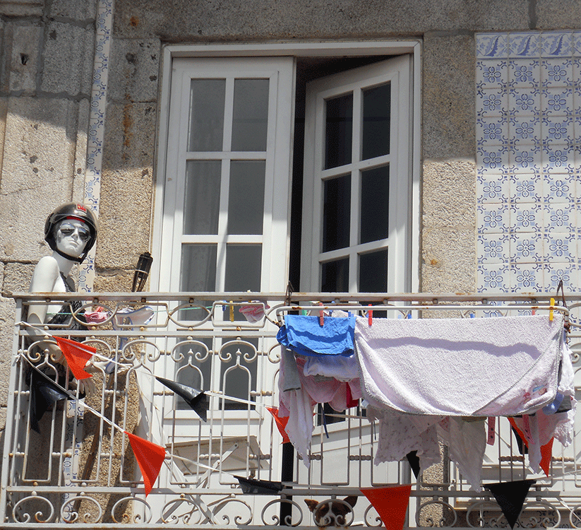 My favorites on morning walks along the banks of the Douro River are those artistically arranged for the entertainment of others – a mannequin for drying underwear or a pair of black undies pinned next to a tile saint.