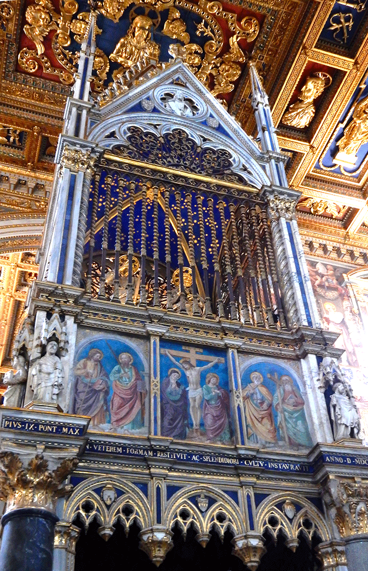 The impressive 1828 silver reliquary, above, containing some of Saint Lawrence’s unidentified smoked body remnants in its chest, is housed amid a collection of impressive silver and gold treasures housed in a museum under the cathedral in Genoa. Included there is a ceremonial casket for transporting the ashes of Saint John the Baptist, presumably not including his head as we viewed it enshrined in Rome in the Basilica di San Silvestro in Capite, on appropriate church holidays. And displayed also is yet another chalice with claims of being used for Jesus’ final sip of wine at the Last Supper. No wonder the search through the centuries for the “real” Holy Grail has been so convoluted and controversial.