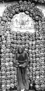 There were six divisions in the apartment, and each division was ornamented with a style of decoration peculiar to itself – and these decorations were in every instance formed of human bones! There were shapely arches, built wholly of thigh bones; there were startling pyramids, built wholly of grinning skulls; there were quaint architectural structures of various kinds, built of shin bones and the bones of the arm; on the wall were elaborate frescoes, whose curving vines were made of knotted human vertebrae; whose delicate tendrils were made of sinews and tendons; whose flowers were formed of knee-caps and toe-nails. Every lasting portion of the human frame was represented in these intricate designs (they were by Michael Angelo, I think,) and there was a careful finish about the work, and an attention to details that betrayed the artist’s love of his labors as well as his schooled ability. I asked the good-natured monk who accompanied us, who did this? And he said, “We did it” – meaning himself and his brethren upstairs. I could see that the old friar took a high pride in his curious show. We made him talkative by exhibiting an interest we never betrayed to guides.