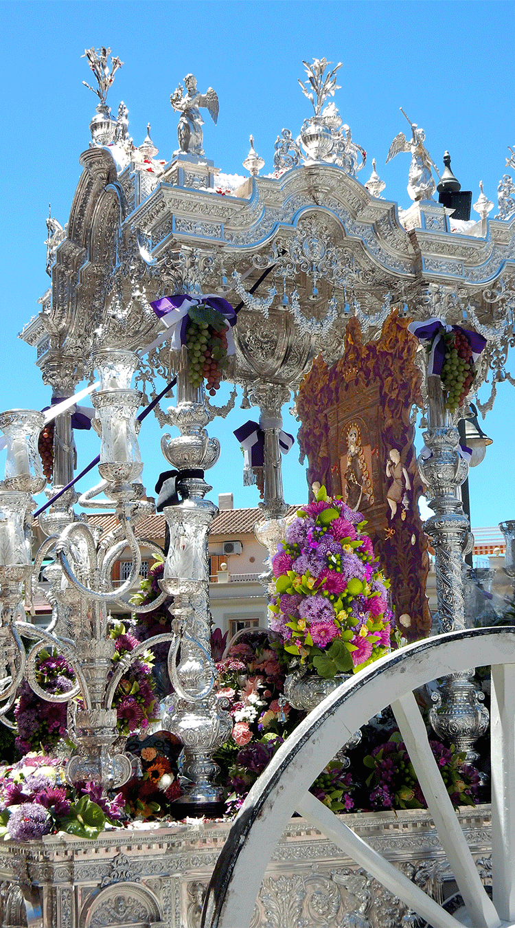 Judging from the silvered coach transporting the banner of the Virgin Mary on a traffic-snarling journey through the streets of Malaga to visit some of city’s other prominent figures of Mary – of which there are many, all elegantly attired and crowned – the banner must be highly regarded by the supporting brotherhood. A team of well-groomed oxen pulled her ahead of a fleet of flatbed tented trailers bearing a host of traditionally costumed followers, refueling themselves periodically from kegs of beer or wine.