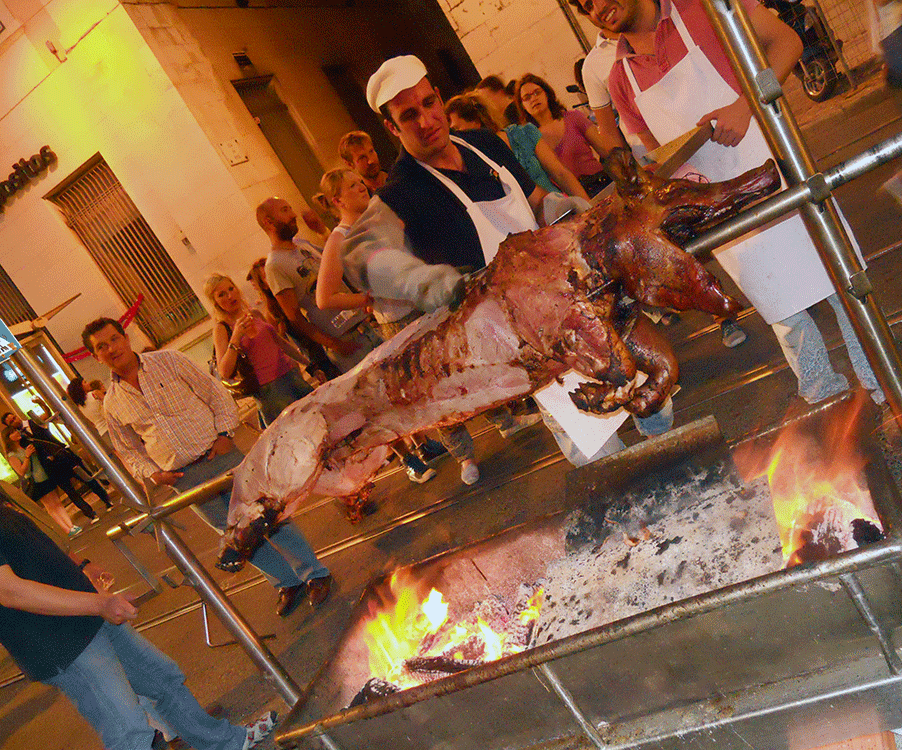 Smoke swirls around booths set up in the streets on the Feast Day of Saint Anthony, and many nights surrounding the date, vending fresh sardines and grilled meats slapped into sandwiches. Some vendors just go whole hog, speared from head to tail.