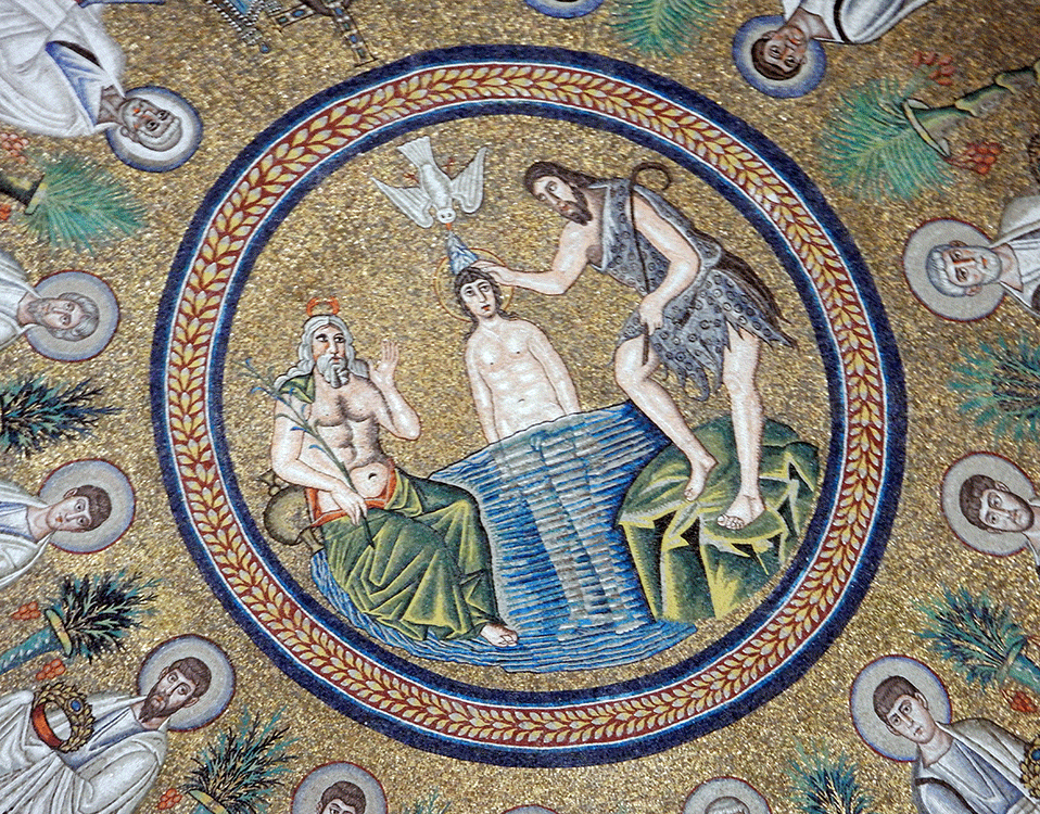 Theodoric’s mosaic artists probably were not Arian because the Holy Ghost, represented as a dove, is hovering above spurting water over the scene above to assist the John the Baptist, modestly clad in a leopard-skin cloak. This was fortunate because, when the Arians were kicked back out of Ravenna only a couple of decades later, the mosaics were not destroyed as heretical.