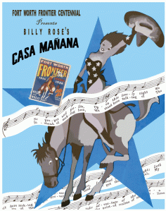 The spectacle covered 162 acres and cost $5 million. The Old West lived again in Frontier Village, in which Sunset Trail was lined with livery stables, general stores, an old church, and other buildings typical of the 1870s to 1890s. A railroad train with wood-burning locomotive and wooden coaches demonstrated transportation of the same period…. The most publicized part of the celebration was Casa Mañana, “the House of Tomorrow,” in which seats and tables to accommodate 3,500 spectators faced a revolving stage on which Billy Rose presented his musical show.