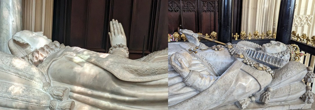 Above left: Monumental effigy of Mary Queen of Scots (1542-1587). Above right: Queen Elizabeth I (1533-1603). Lady Chapel, Westminster Abbey